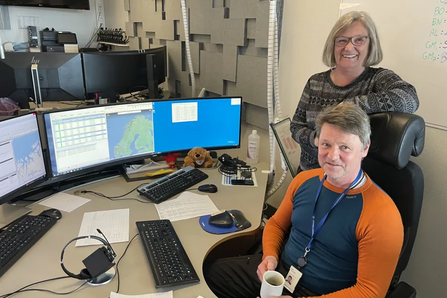 Det er Jørn Tollånes og Siv Nordmo som er på jobb når vi besøker FKS denne dagen. Flykoordineringssentralen holder i dag til i samme lokale som AMK-sentralen til Universitetssykehuset i Nord-Norge, men de koordinerer alle landets ambulansefly.